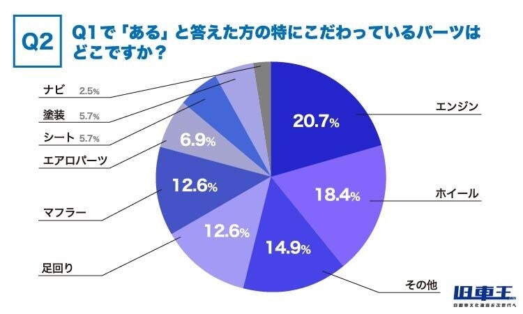 次いで「ホイール」が18.4%、「足回り」、「マフラー」がそれぞれ12.6%、「エアロパーツ」が6.9%という結果になりました。「その他」の回答は14.9%で、「ブレーキ」と答えた方や「純正部品の確保」という意見が複数見られ、フルレストアを施したという方もいらっしゃいました。