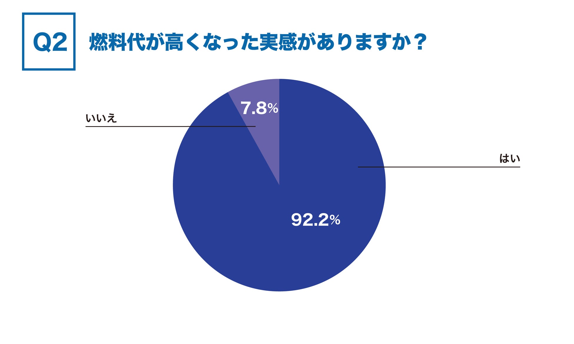 しかしながら、燃料代が高くなったと感じないと回答した方が7.8%いることもわかりました。使用頻度にもよるのでしょうか。価格が高くなったと感じる基準は人それぞれですね。