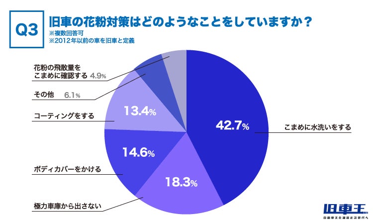 Q1で「はい」と答えた方に旧車の花粉対策について聞いてみると、「こまめに水洗いをする」が42.7%で最も多く、次に多かった回答が「極力車庫から出さない」で18.3%という結果になりました。