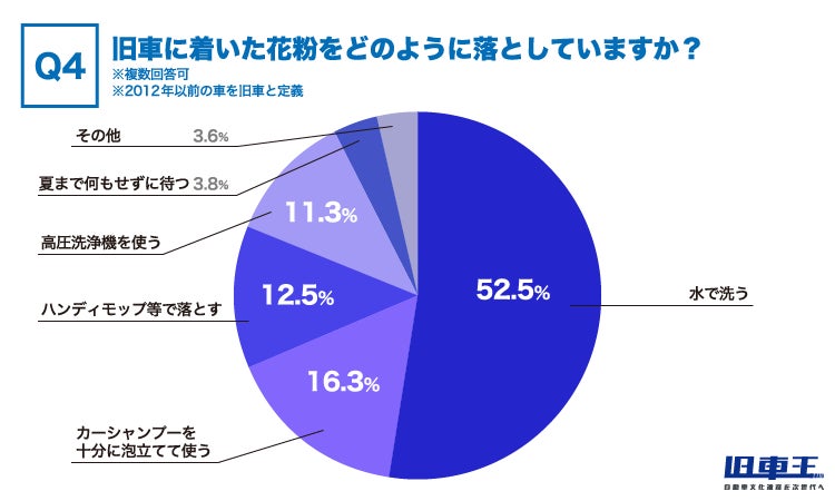 付着した花粉がシミになる前に、水洗いしてあげることできれいな状態を保つことができます。旧車乗りで花粉を気にしている方の多くがまめにメンテナンスをしていることが伺える結果となりました。