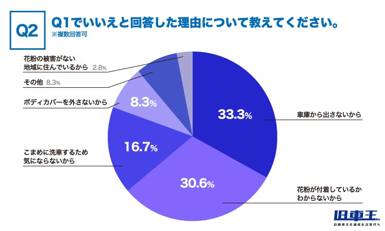 Q1で「いいえ」と答えた方にその理由を聞いてみると、最も多かった回答が「車庫から出さないから」で33.3%、次に多かった回答が「花粉が付着しているかわからないから」で30.6%でした。