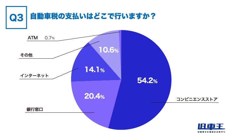 旧車乗りに自動車税の支払いをどこで行うか聞いてみたところ、最も多かった回答が「コンビニエンスストア」54.2%でした。