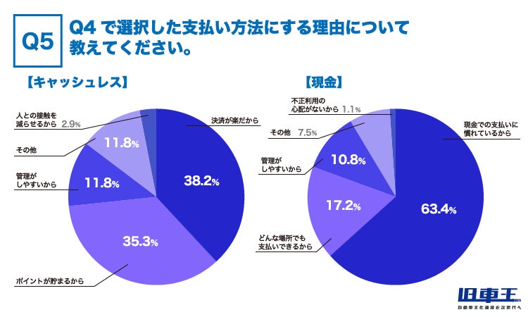 最後に、Q4で回答した支払い方法を選んでいる理由について現金派・キャッシュレス派に分けて聞いてみると、現金派で最も多かった回答は「現金での支払いに慣れているから」63.4%、キャッシュレス派の理由は「決済が楽だから」38.2%という回答結果になりました。