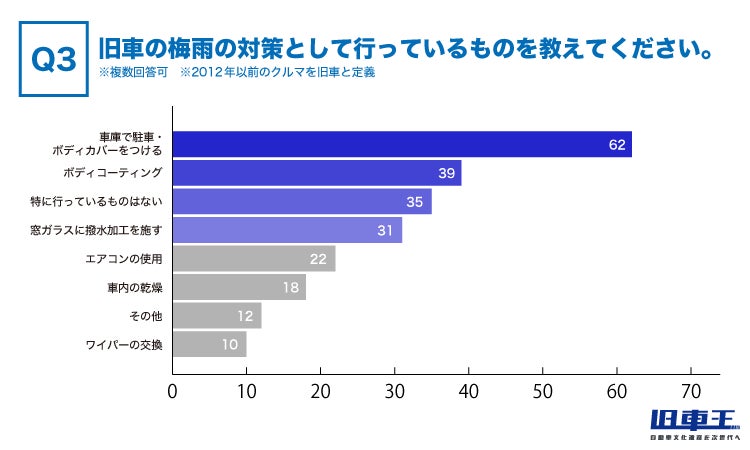 旧車の梅雨の対策として行なっているものを聞いてみたところ、1位が「車庫で駐車・ボディカバーをつける」で62票でした。