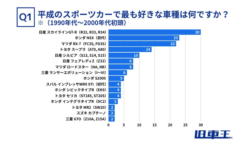 ・調査内容:Q1. 平成のスポーツカーで最も好きな車種は何ですか?※(1990年代〜2000年代初頭) Q2.Q1で選んだ平成スポーツカーの最も魅力に感じる点は何ですか?※複数選択可