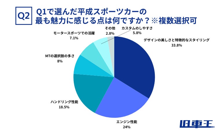 Q1で選んだ平成スポーツカーの最も魅力に感じる点について聞いてみると、総合的に最も多かった回答は「デザインの美しさと特徴的なスタイリング」33.8%、次いで「エンジン性能」24.0%、3位が「ハンドリング性能」18.5%という結果になりました。